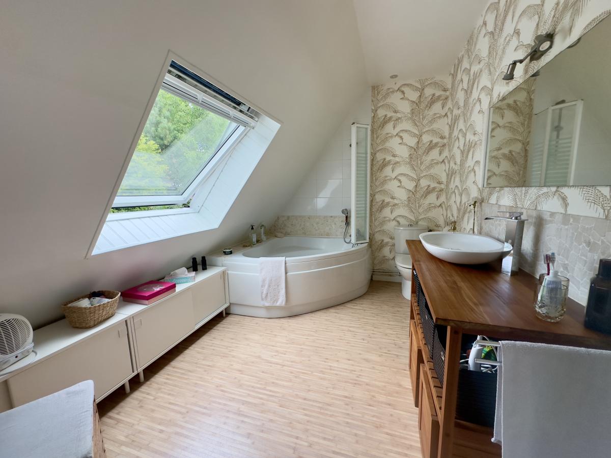 A l'étage grand palier avec espace bureau desservant 3 chambres et une salle de bains avec baignoire d'angle et wc.